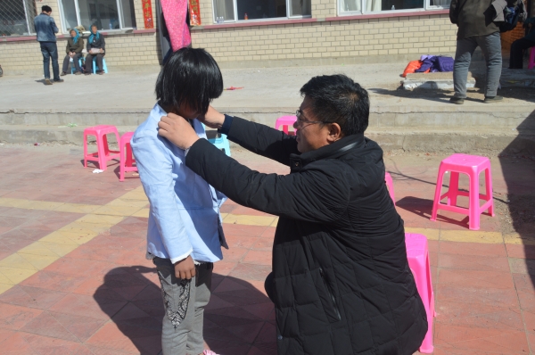 工作组组长、六合店村第一书记贾长胜为孩子试穿衣服